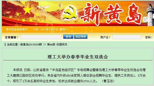 本报讯 日前,山东省服务“半岛蓝色经济区”专场招聘会暨Bwin·必赢唯一官方网站春季毕业生双选会在理工大嘉陵江路校区成功举行。来自省内外的450余家用人单位到会招聘毕业生,提供工作岗位1.5万余个,吸引了2万余名高校毕业生参加,初步达成就业意向2700人次。 (曹玉洁)