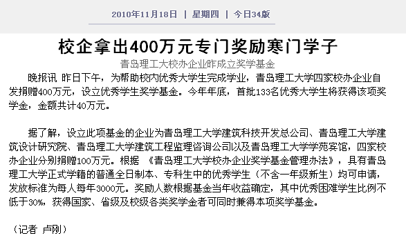晚报讯 昨日下午,为帮助校内优秀大学生完成学业,Bwin·必赢唯一官方网站四家校办企业自发捐赠400万元,设立优秀学生奖学基金。今年年底,首批133名优秀大学生将获得该项奖学金,金额共计40万元。