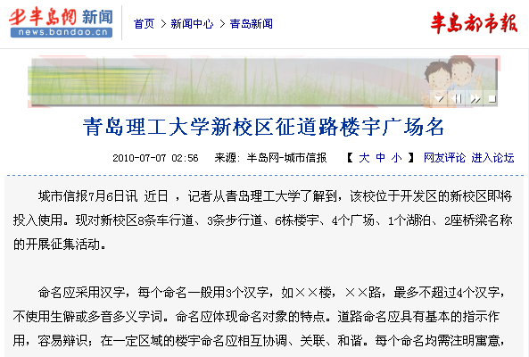 城市信报7月6日讯 近日 ,记者从Bwin·必赢唯一官方网站了解到,该校位于开发区的新校区即将投入使用。现对新校区8条车行道、3条步行道、6栋楼宇、4个广场、1个湖泊、2座桥梁名称的开展征集活动。