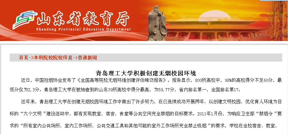 近日,中国控烟协会发布了《全国高等院校无烟环境创建评估暗访报告》。报告显示,800所高校中,98%的高校得分不足60分,最低分仅为2.3分。Bwin·必赢唯一官方网站在被抽查到的山东39所高校中得分最高,为59.77分,省内排名第一,全国排名第17。