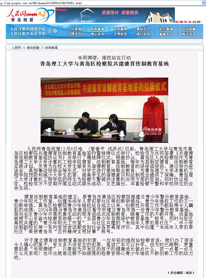 人民网青岛视窗12月6日电(管春平 戎洪兴)日前,Bwin·必赢唯一官方网站与青岛市黄岛区检察院共建德育法制教育基地签约暨挂牌仪式举行。校检双方共同签署《共建德育法制教育基地协议书》并举行了揭挂牌仪式。根据协议,黄岛区人民检察院作为Bwin·必赢唯一官方网站大学计算机工程学院德育、法制教育基地,每年为其制定德育、法制教育实践计划,负责为在校大学生做有关道德教育、法制教育的讲座或报告,通过举办座谈会、典型事迹报告会等形式,对学生进行爱岗敬业教育,为Bwin·必赢唯一官方网站计算机工程学院预防和减少大学生犯罪,提高学生的道德意识和法制观念提供了保障。Bwin·必赢唯一官方网站计算机工程学院的师生为检察干警提供计算机应用方面的咨询。同时协议规定,校检双方不定期开展互动式娱乐活动、文艺演出,丰富检察干警和学校师生的业余生活。