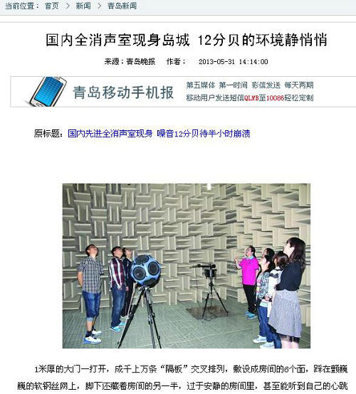 据她介绍,在这种极度安静的环境下,人会马上感觉到孤独和轻微的恐惧,如此压抑的空间,正常人待上半个小时往往就会崩溃。但实际上作为实验室的这个房间里,放置了自由声场传声器,可以由隔壁的仪器设备进行监控,在真正的实验过程中,人无需待在消声室内,就能通过双通道声学实时分析仪进行实验操作。 “2006年这个消声室建设的时候,达到了国内最先进水平,我们也是国内为数不多的拥有全消声室的建筑院校。 ”于红霞告诉记者,这个巨大的“安静空间”,既可以进行自由声场的特性实验和研究,也能进行声源声功率的标准测试和相关噪声测试。 (记者 王晓雨)