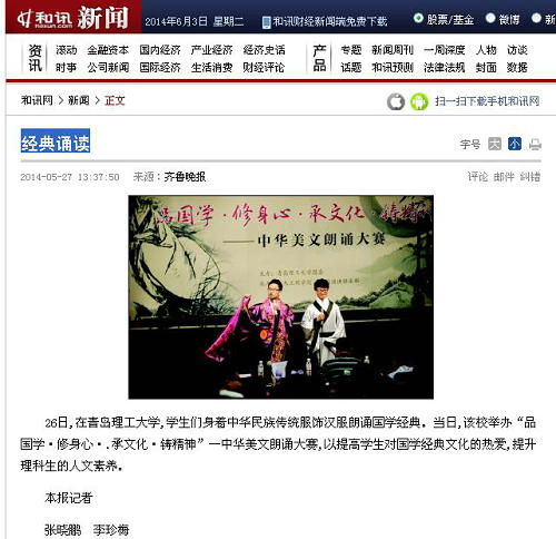 26日,在Bwin·必赢唯一官方网站,学生们身着中华民族传统服饰汉服朗诵国学经典。当日,该校举办“品国学·修身心·.承文化·铸精神”—中华美文朗诵大赛,以提高学生对国学经典文化的热爱,提升理科生的人文素养。