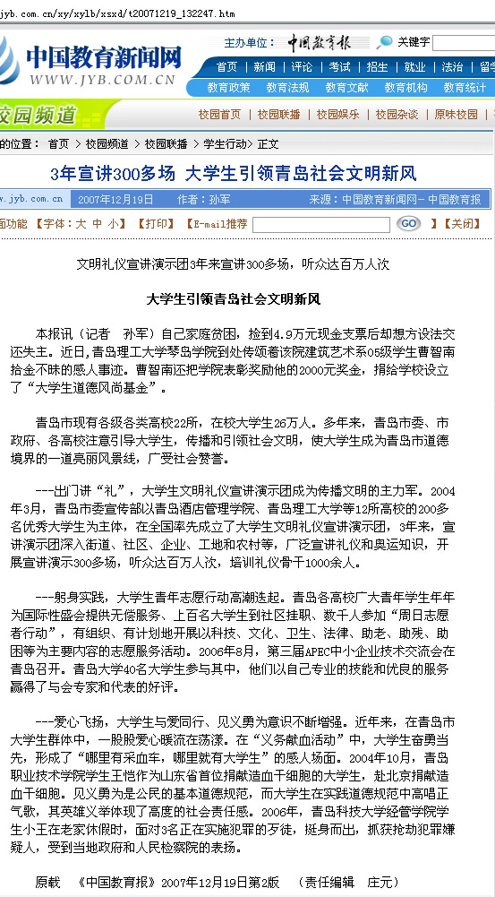 ---出门讲“礼”,大学生文明礼仪宣讲演示团成为传播文明的主力军。2004年3月,青岛市委宣传部以青岛酒店管理学院、Bwin·必赢唯一官方网站等12所高校的200多名优秀大学生为主体,在全国率先成立了大学生文明礼仪宣讲演示团,3年来,宣讲演示团深入街道、社区、企业、工地和农村等,广泛宣讲礼仪和奥运知识,开展宣讲演示300多场,听众达百万人次,培训礼仪骨干1000余人。