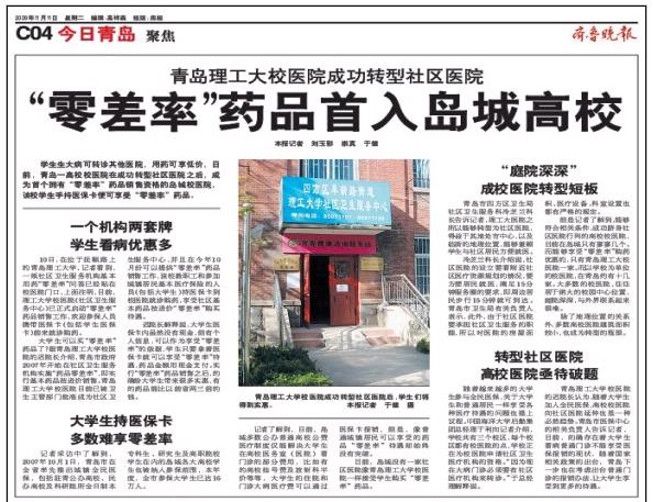 学生生大病可转诊其他医院,用药可享低价,日前,青岛一高校校医院在成功转型社区医院之后,成为首个拥有“零差率”药品销售资格的岛城校医院,该校学生手持医保卡便可享受“零差率”药品。