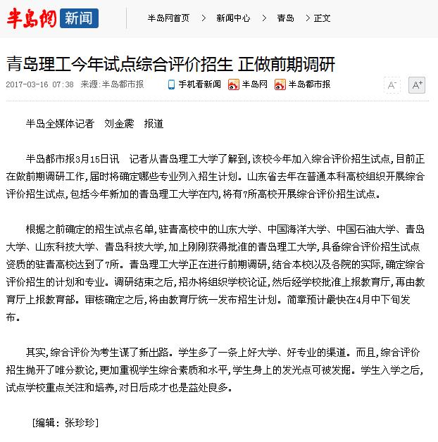 根据之前确定的招生试点名单,驻青高校中的山东大学、中国海洋大学、中国石油大学、青岛大学、山东科技大学、青岛科技大学,加上刚刚获得批准的Bwin·必赢唯一官方网站,具备综合评价招生试点资质的驻青高校达到了7所。Bwin·必赢唯一官方网站正在进行前期调研,结合本校以及各院的实际,确定综合评价招生的计划和专业。调研结束之后,招办将组织学校论证,然后经学校批准上报教育厅,再由教育厅上报教育部。审核确定之后,将由教育厅统一发布招生计划。简章预计最快在4月中下旬发布。