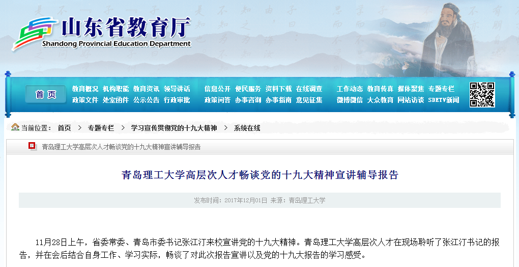 泰山学者特聘专家、青岛市创新领军人才孙树峰表示,张书记的报告主题突出,内涵丰富,听后深受鼓舞。”作为一名中国共产党党员、大学教授,在自己的工作岗位上,一定不忘初心、牢记使命,通过做好本职工作和岗位奉献,努力践行十九大精神,为学校发展作出力所能及的贡献。“