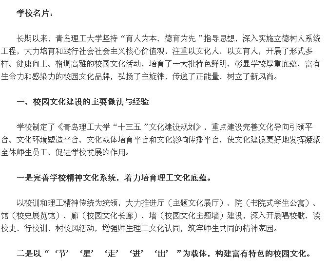 以校训和理工精神传统为统领,大力推进厅(主题文化展厅)、院(书院式学生公寓)、馆(校史展览馆)、廊(校园文化长廊)、墙(校园文化主题墙)建设,深入开展唱校歌、读校史、行校训、树校风活动,增强师生理工文化认同,筑牢师生共同的精神家园。