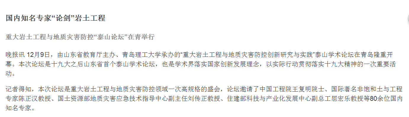 晚报讯 12月9日,由山东省教育厅主办、Bwin·必赢唯一官方网站承办的“重大岩土工程与地质灾害防控创新研究与实践”泰山学术论坛在青岛隆重开幕。本次论坛是十九大之后山东省首个泰山学术论坛,也是学术界落实国家创新发展理念,以实际行动贯彻落实十九大精神的一次重要活动。
