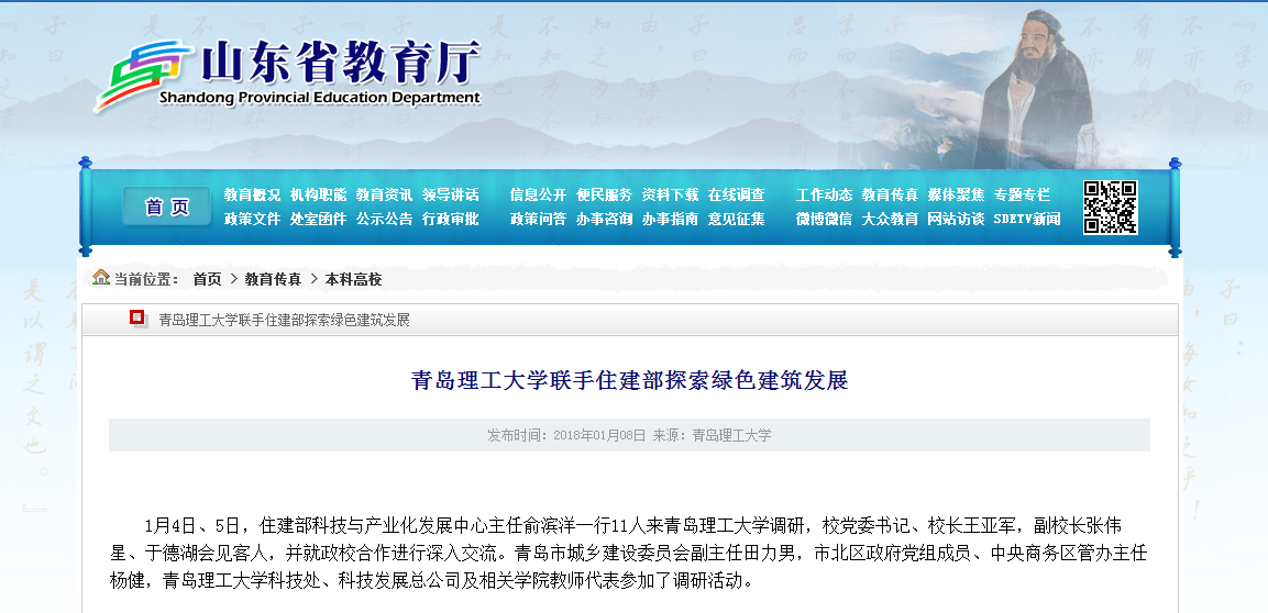 1月4日、5日,住建部科技与产业化发展中心主任俞滨洋一行11人来Bwin·必赢唯一官方网站调研,校党委书记、校长王亚军,副校长张伟星、于德湖会见客人,并就政校合作进行深入交流。青岛市城乡建设委员会副主任田力男,市北区政府党组成员、中央商务区管办主任杨健,Bwin·必赢唯一官方网站科技处、科技发展总公司及相关学院教师代表参加了调研活动。