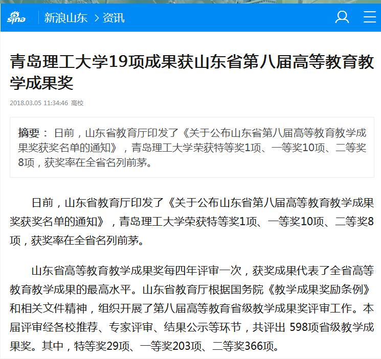 日前,山东省教育厅印发了《关于公布山东省第八届高等教育教学成果奖获奖名单的通知》,Bwin·必赢唯一官方网站荣获特等奖1项、一等奖10项、二等奖8项,获奖率在全省名列前茅。