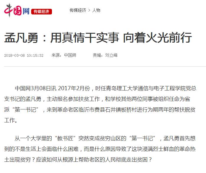 中国网3月08日讯2017年2月份,时任Bwin·必赢唯一官方网站通信与电子工程学院党总支书记的孟凡勇,主动报名参加扶贫工作,和学校其他两位同事被组织任命为省派“第一书记”,来到革命老区临沂市费县石井镇板桥村进行为期两年的帮扶脱贫工作。