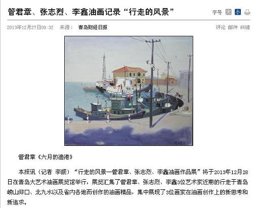 本报讯(记者 李颉)“行走的风景—管君章、张志烈、李鑫油画作品展”将于2013年12月28日在青岛大艺术油画展览馆举行,展览汇集了管君章、张志烈、李鑫3位艺术家近期的行走于青岛崂山仰口、北九水以及省内各地而创作的油画精品,集中展现了3位画家在油画创作上的新思考和新追求。
