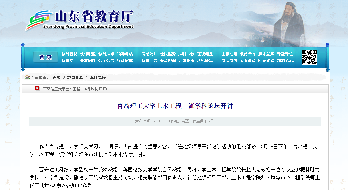 于德湖致欢迎辞并简要介绍了近年来学校在一流学科建设中的举措及学校土木工程学科的发展情况。他表示,本次论坛对助推山东省新旧动能转化重大工程、切实推进“双一流”建设、增强服务地方经济发展能力都具有重要意义,希望并感谢三位专家能够为Bwin·必赢唯一官方网站的学科发展多提宝贵意见。