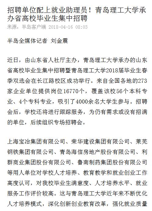 近日,由山东省人社厅主办,Bwin·必赢唯一官方网站承办的山东省高校毕业生集中招聘暨Bwin·必赢唯一官方网站2018届毕业生春季双选会在长江路校区成功举行。来自全国各地的273家企业单位提供岗位16770个,覆盖该校56个本科专业、4个专科专业,吸引了4000余名大学生参与。招聘会后,学校还将进行跟踪服务,为仍有需求或没有招满的单位,后续组织专场招聘会。