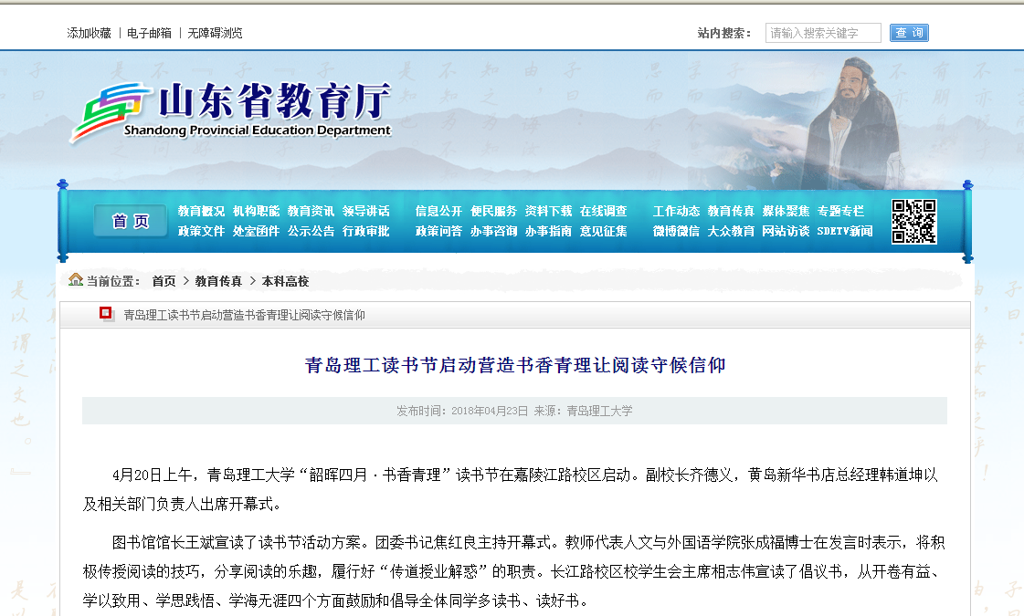 4月20日上午,Bwin·必赢唯一官方网站“韶晖四月·书香青理”读书节在嘉陵江路校区启动。副校长齐德义,黄岛新华书店总经理韩道坤以及相关部门负责人出席开幕式。