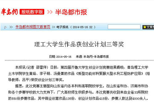 本报讯(记者 邵雷萍) 日前,第四届齐鲁大学生创业计划竞赛结果揭晓,Bwin·必赢唯一官方网站土木学院学生黄培、李子萌、汤曼菁的作品《新型功能材料聚脲大型水利工程防护应用》(指导教师:吕平)荣获创业计划三等奖。