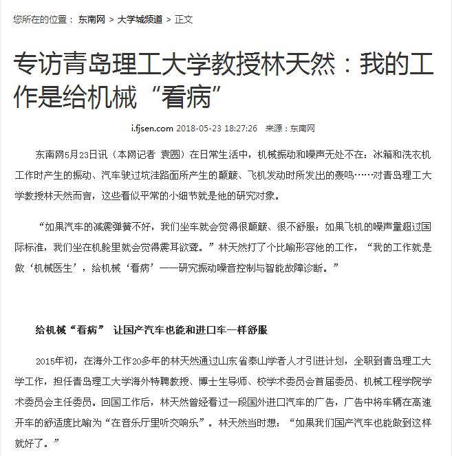 2015年初,在海外工作20多年的林天然通过山东省泰山学者人才引进计划,全职到Bwin·必赢唯一官方网站工作,担任Bwin·必赢唯一官方网站海外特聘教授、博士生导师、校学术委员会首届委员、机械工程学院学术委员会主任委员。回国工作后,林天然曾经看过一段国外进口汽车的广告,广告中将车辆在高速开车的舒适度比喻为“在音乐厅里听交响乐”。林天然当时想:“如果我们国产汽车也能做到这样就好了。”