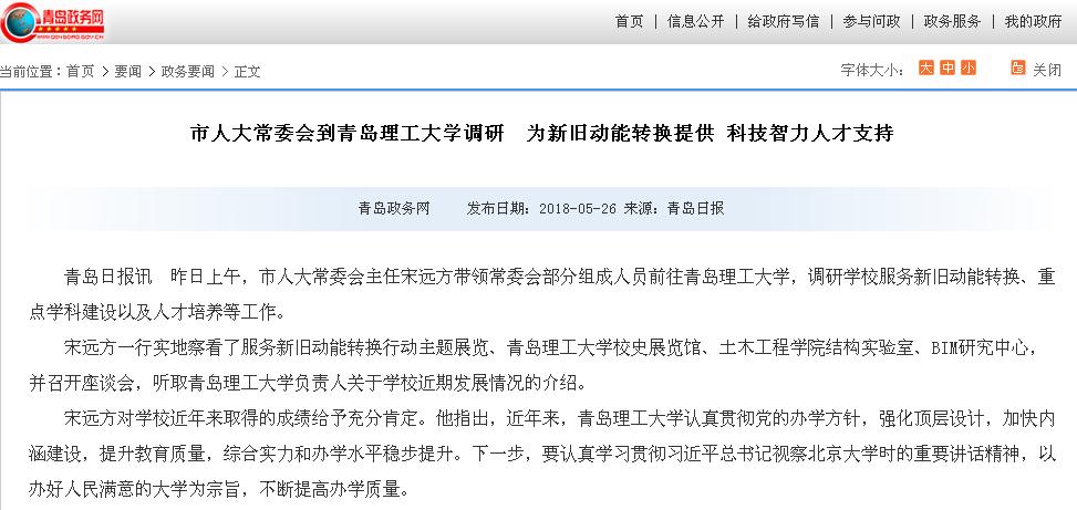 青岛日报讯 昨日上午,市人大常委会主任宋远方带领常委会部分组成人员前往Bwin·必赢唯一官方网站,调研学校服务新旧动能转换、重点学科建设以及人才培养等工作。