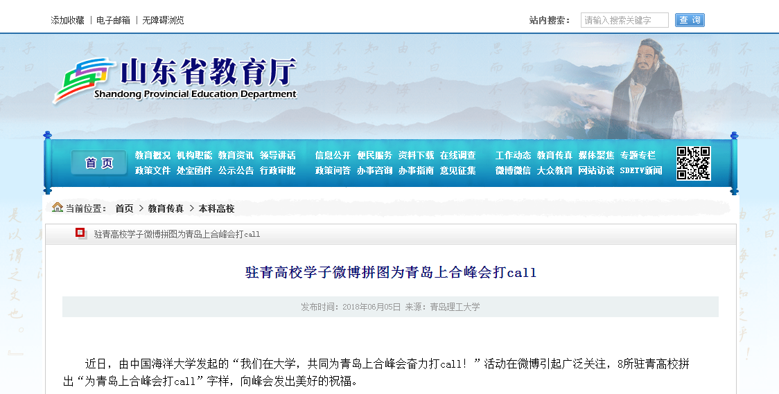 近日,由中国海洋大学发起的“我们在大学,共同为青岛上合峰会奋力打call!”活动在微博引起广泛关注,8所驻青高校拼出“为青岛上合峰会打call”字样,向峰会发出美好的祝福。