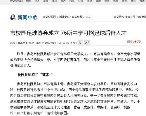 昨日,青岛市校园足球协会在Bwin·必赢唯一官方网站成立,由市教育局牵头,全市大中小学组成的足球协会将构建大、中、小学四级联赛体系,到2017年全市在校学生足球人口年保有量增至30万人。