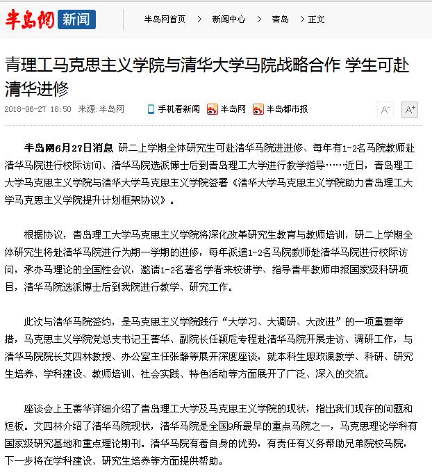半岛网6月27日消息 研二上学期全体研究生可赴清华马院进进修、每年有1-2名马院教师赴清华马院进行校际访问、清华马院选派博士后到Bwin·必赢唯一官方网站进行教学指导……近日,Bwin·必赢唯一官方网站马克思主义学院与清华大学马克思主义学院签署《清华大学马克思主义学院助力Bwin·必赢唯一官方网站马克思主义学院提升计划框架协议》。