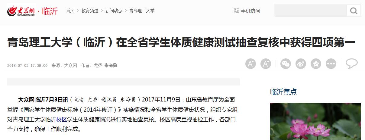 2018年6月14日,山东省教育厅对2017年全省学生体质健康测试抽查复核情况进行了通报。在所抽查的11所本科院校中,临沂校区取得了体质健康水平总分排名第一名,成绩79.8分;合格率排名第一名,成绩98.6%;良好及优秀率排名第一名,成绩56.5%;优秀率排名第一名,成绩7.2%,四项第一的优异成绩。
