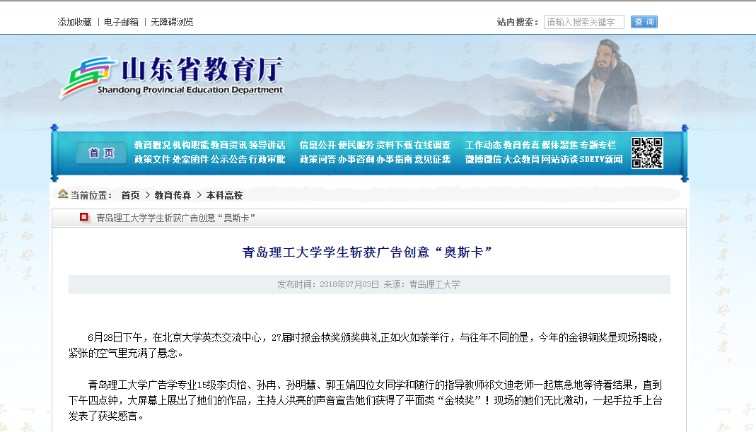 Bwin·必赢唯一官方网站广告学专业15级李贞怡、孙冉、孙明慧、郭玉娟四位女同学和随行的指导教师祁文迪老师一起焦急地等待着结果,直到下午四点钟,大屏幕上展出了她们的作品,主持人洪亮的声音宣告她们获得了平面类“金犊奖”!现场的她们无比激动,一起手拉手上台发表了获奖感言。