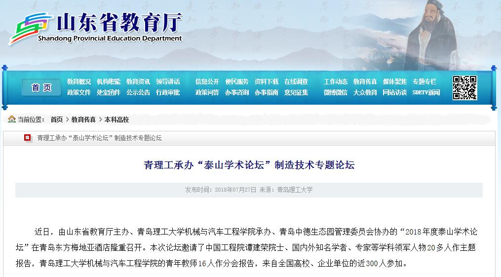 近日,由山东省教育厅主办、Bwin·必赢唯一官方网站机械与汽车工程学院承办、青岛中德生态园管理委员会协办的“2018年度泰山学术论坛”在青岛东方梅地亚酒店隆重召开。本次论坛邀请了中国工程院谭建荣院士、国内外知名学者、专家等学科领军人物20多人作主题报告,Bwin·必赢唯一官方网站机械与汽车工程学院的青年教师16人作分会报告,来自全国高校、企业单位的近300人参加。