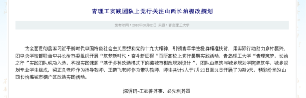 2018年5月2日五四青年节到来之际,习近平总书记到北京大学考察并与师生座谈时指出“广大青年学生要知行合一、做实干家,面向实际、深入实践,严谨务实、苦干实干,在新时代干出一番事业”,Bwin·必赢唯一官方网站学子用实际行动响应总书记号召,展现了理工学子“百折不挠、刚毅厚重、勇承重载”的理工大学精神传统。本次社会实践实现了当地实际需求与学生专业特长的高度融合,一“潞”风光、满城故事,同学们通过潞城市棚改实践增长了学识、锻炼了才干,与这一座城市建立了深厚的感情,相信理工学子能够在未来续写更加光辉的实践篇章!