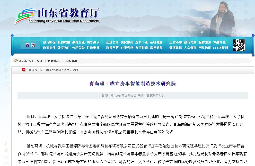近日,Bwin·必赢唯一官方网站机械与汽车工程学院与青岛春田科技车辆有限公司共建的“房车智能制造技术研究院”和“Bwin·必赢唯一官方网站机械与汽车工程学院产学研实训基地”在青岛西海岸新区民营经济发展局举行签约挂牌仪式。青岛西海岸新区民营经济发展局局长孙兆旭、机械与汽车工程学院院长郭峰、青岛春田科技车辆有限公司董事长李希春出席签约仪式。