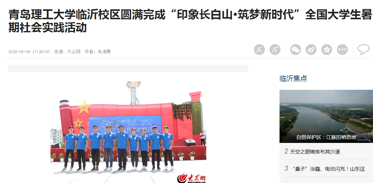 实践队进军营、进社区,广泛开展文艺演出和理论宣讲活动,圆满完成实践计划,实践团队得到新浪网、长白电视台的采访,实践团队先后被大众网、新浪网、鲁南网、鲁南商报、吉林卫视公共频道、白山电视台、长白电视台、白山共青团、临沂市学联等各级网络、电视、平面媒体报道十余次。(通讯记者 朱海勇)