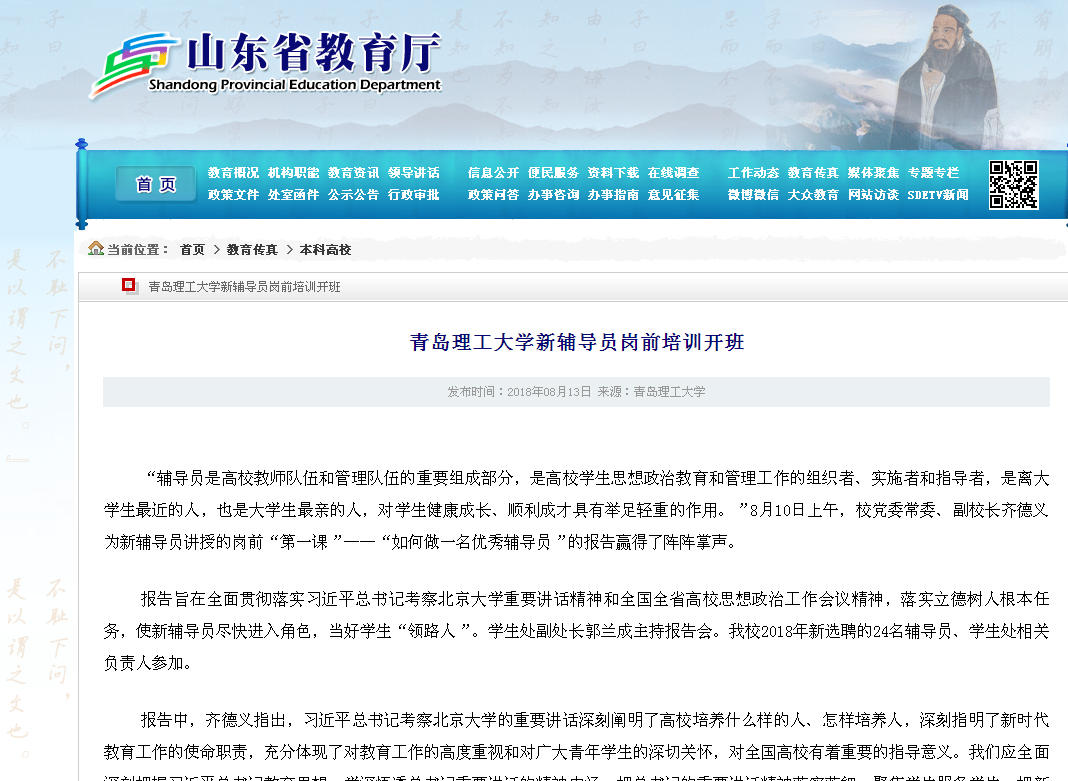 “辅导员是高校教师队伍和管理队伍的重要组成部分,是高校学生思想政治教育和管理工作的组织者、实施者和指导者,是离大学生最近的人,也是大学生最亲的人,对学生健康成长、顺利成才具有举足轻重的作用。”8月10日上午,校党委常委、副校长齐德义为新辅导员讲授的岗前“第一课”——“如何做一名优秀辅导员”的报告赢得了阵阵掌声。