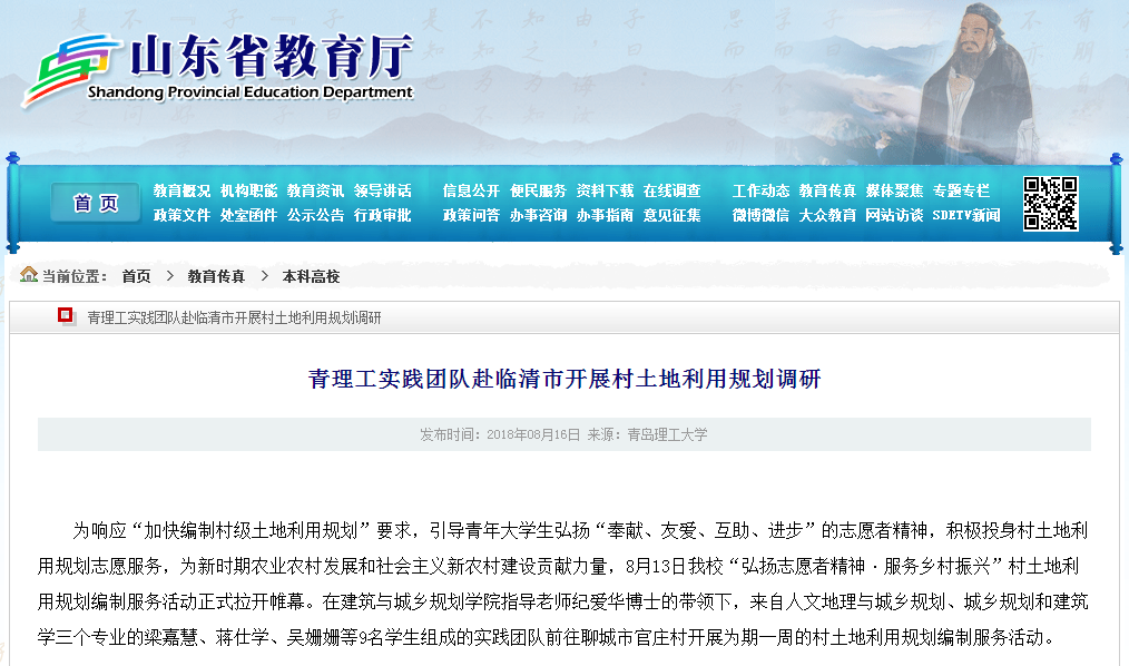为响应“加快编制村级土地利用规划”要求,引导青年大学生弘扬“奉献、友爱、互助、进步”的志愿者精神,积极投身村土地利用规划志愿服务,为新时期农业农村发展和社会主义新农村建设贡献力量,8月13日必赢官网“弘扬志愿者精神·服务乡村振兴”村土地利用规划编制服务活动正式拉开帷幕。在建筑与城乡规划学院指导老师纪爱华博士的带领下,来自人文地理与城乡规划、城乡规划和建筑学三个专业的梁嘉慧、蒋仕学、吴姗姗等9名学生组成的实践团队前往聊城市官庄村开展为期一周的村土地利用规划编制服务活动。