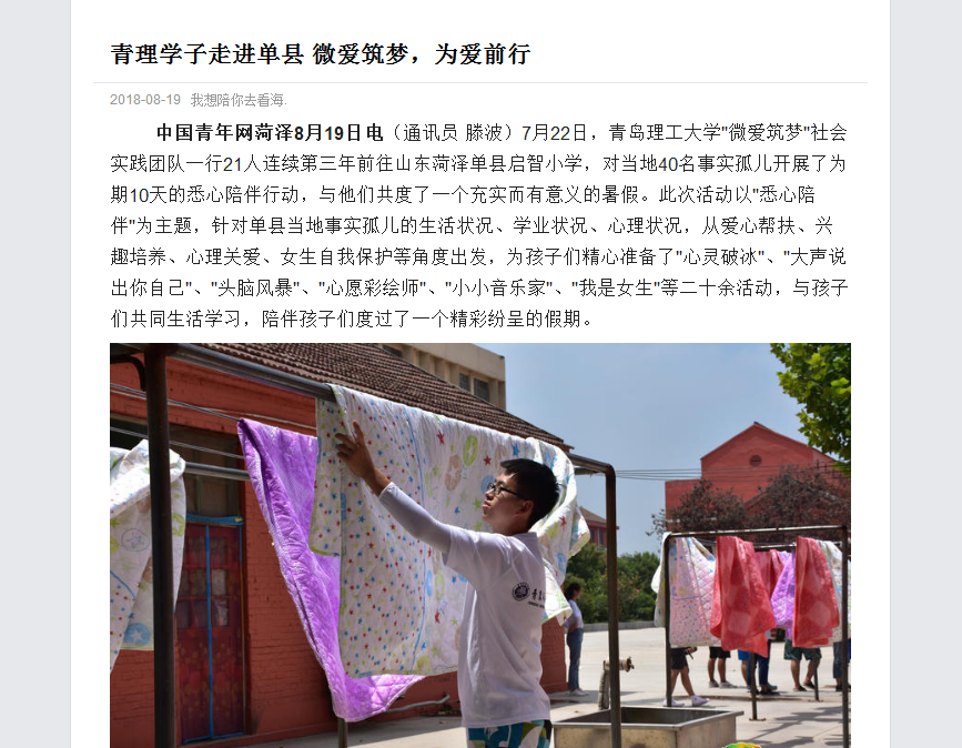 7月22日,Bwin·必赢唯一官方网站"微爱筑梦"社会实践团队一行21人连续第三年前往山东菏泽单县启智小学,对当地40名事实孤儿开展了为期10天的悉心陪伴行动,与他们共度了一个充实而有意义的暑假。此次活动以"悉心陪伴"为主题,针对单县当地事实孤儿的生活状况、学业状况、心理状况,从爱心帮扶、兴趣培养、心理关爱、女生自我保护等角度出发,为孩子们精心准备了"心灵破冰"、"大声说出你自己"、"头脑风暴"、"心愿彩绘师"、"小小音乐家"、"我是女生"等二十余活动,与孩子们共同生活学习,陪伴孩子们度过了一个精彩纷呈的假期。