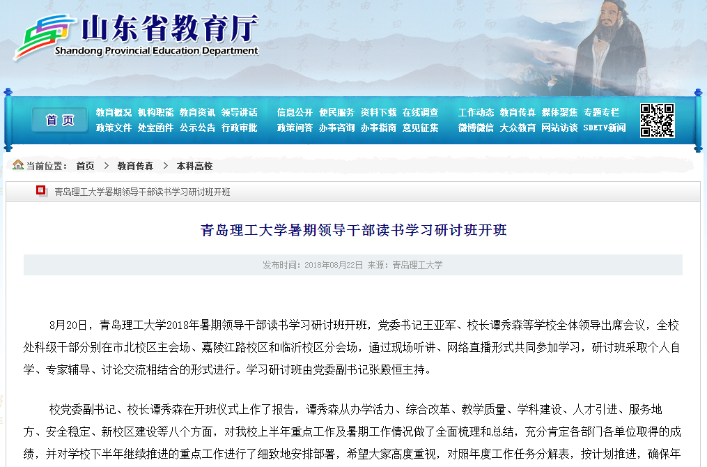 8月20日,Bwin·必赢唯一官方网站2018年暑期领导干部读书学习研讨班开班,党委书记王亚军、校长谭秀森等学校全体领导出席会议,全校处科级干部分别在市北校区主会场、嘉陵江路校区和临沂校区分会场,通过现场听讲、网络直播形式共同参加学习,研讨班采取个人自学、专家辅导、讨论交流相结合的形式进行。学习研讨班由党委副书记张殿恒主持。