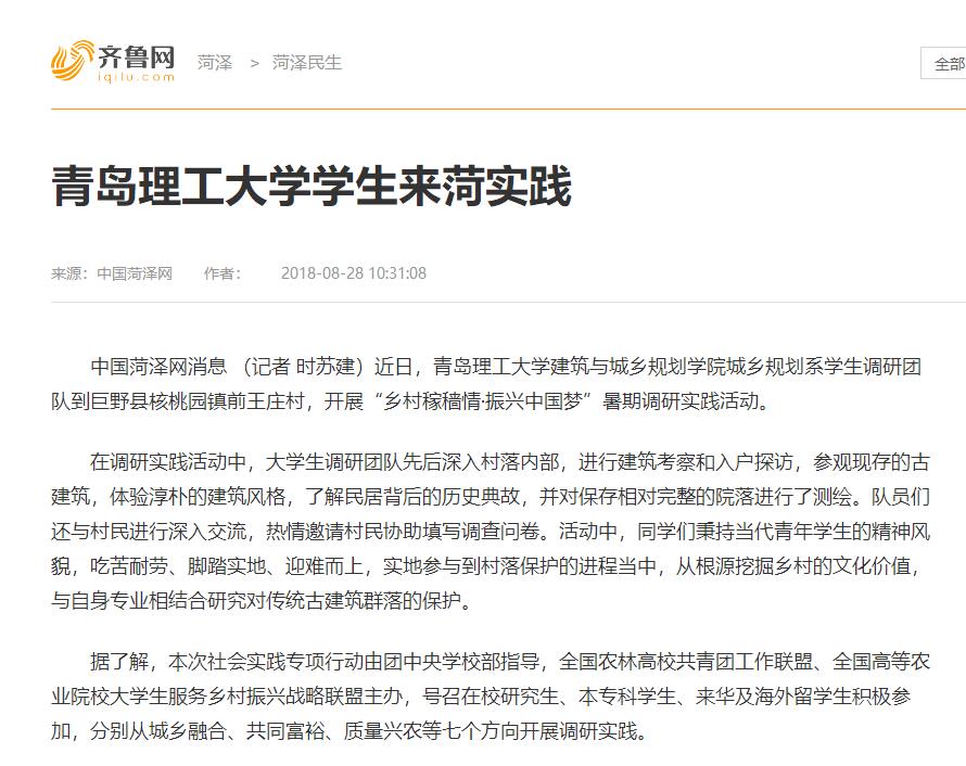 中国菏泽网消息 (记者 时苏建)近日,Bwin·必赢唯一官方网站建筑与城乡规划学院城乡规划系学生调研团队到巨野县核桃园镇前王庄村,开展“乡村稼穑情·振兴中国梦”暑期调研实践活动。