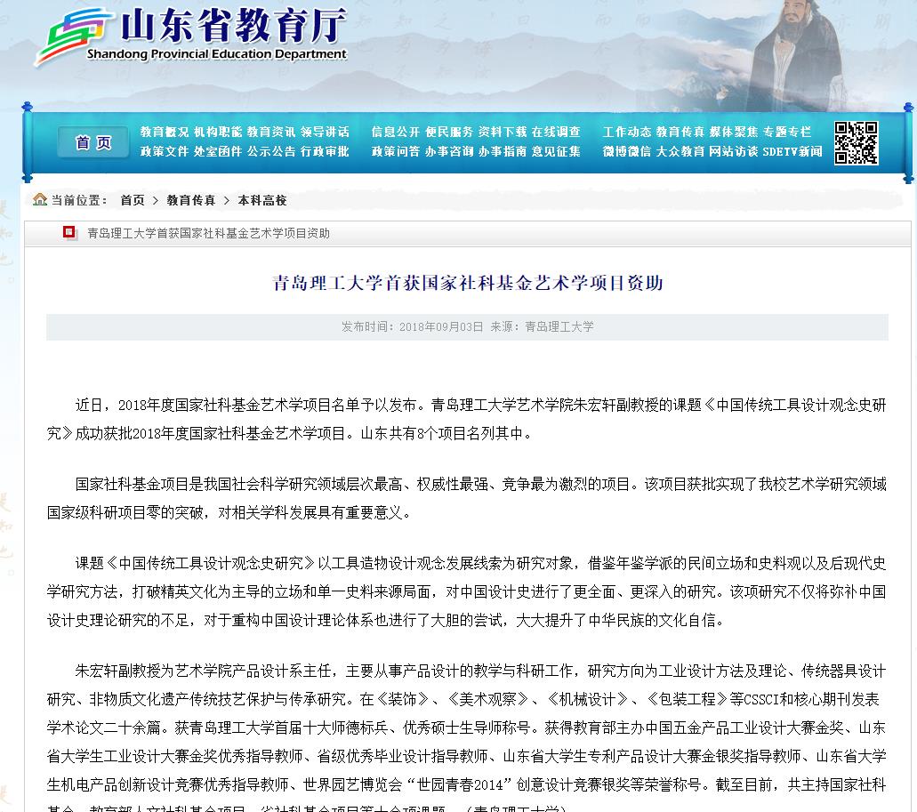 近日,2018年度国家社科基金艺术学项目名单予以发布。Bwin·必赢唯一官方网站艺术学院朱宏轩副教授的课题《中国传统工具设计观念史研究》成功获批2018年度国家社科基金艺术学项目。山东共有8个项目名列其中。