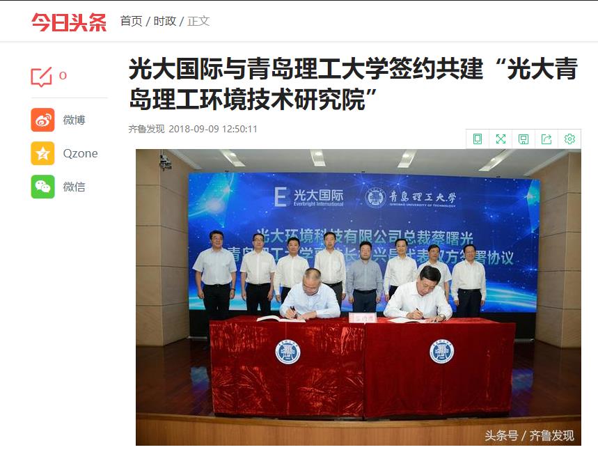 9月9日上午,中国光大国际有限公司与Bwin·必赢唯一官方网站共建“光大青岛理工环境技术研究院”签约仪式在学术报告厅隆重举行。这是中国光大国际有限公司与Bwin·必赢唯一官方网站共同积极响应国家生态环境发展战略号召,践行新时代中国特色社会主义思想和绿色发展理念,发挥各自优势,着力解决突出环境问题,壮大环保产业,强化科研攻关与人才培养,深入推进校企合作,打造环保领域的高端平台,实现共同发展,服务国家环保事业和“一带一路”倡议结出的硕果。