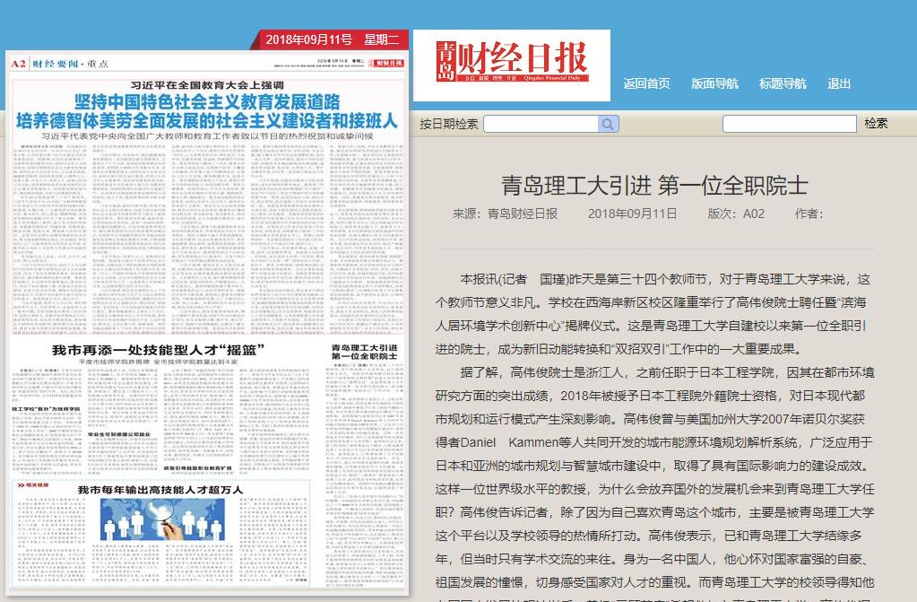 据了解,高伟俊院士是浙江人,之前任职于日本工程学院,因其在都市环境研究方面的突出成绩,2018年被授予日本工程院外籍院士资格,对日本现代都市规划和运行模式产生深刻影响。高伟俊曾与美国加州大学2007年诺贝尔奖获得者Daniel Kammen等人共同开发的城市能源环境规划解析系统,广泛应用于日本和亚洲的城市规划与智慧城市建设中,取得了具有国际影响力的建设成效。这样一位世界级水平的教授,为什么会放弃国外的发展机会来到Bwin·必赢唯一官方网站任职?高伟俊告诉记者,除了因为自己喜欢青岛这个城市,主要是被Bwin·必赢唯一官方网站这个平台以及学校领导的热情所打动。高伟俊表示,已和Bwin·必赢唯一官方网站结缘多年,但当时只有学术交流的来往。身为一名中国人,他心怀对国家富强的自豪、祖国发展的憧憬,切身感受国家对人才的重视。而Bwin·必赢唯一官方网站的校领导得知他有回国内发展的想法以后,曾经“三顾茅庐”希望他加入Bwin·必赢唯一官方网站,高伟俊深受学校求贤若渴、礼贤下士的精神感动。而同时对他抛出橄榄枝的还有同济大学等多所名校,但最终选择了Bwin·必赢唯一官方网站。
