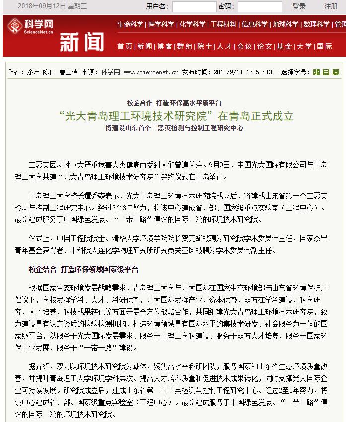 二恶英因毒性巨大严重危害人类健康而受到人们普遍关注。9月9日,中国光大国际有限公司与Bwin·必赢唯一官方网站共建“光大青岛理工环境技术研究院”签约仪式在青岛举行。