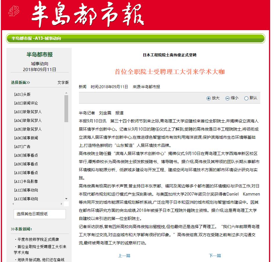 高伟俊具有极高的学术声誉,曾主持日本东京都、福冈及周边等多个都市圈的环境模拟与评估工作,对日本现代都市规划和运行模式产生深刻影响。与美国加州大学2007年诺贝尔奖获得者Daniel Kammen等共同开发的城市能源环境规划解析系统,广泛应用于日本和亚洲的城市规划与智慧城市建设中。因其在都市环境研究方面的突出成绩,2018年被授予日本工程院外籍院士资格。据介绍,这是Bwin·必赢唯一官方网站自建校以来引进的第一位全职院士。