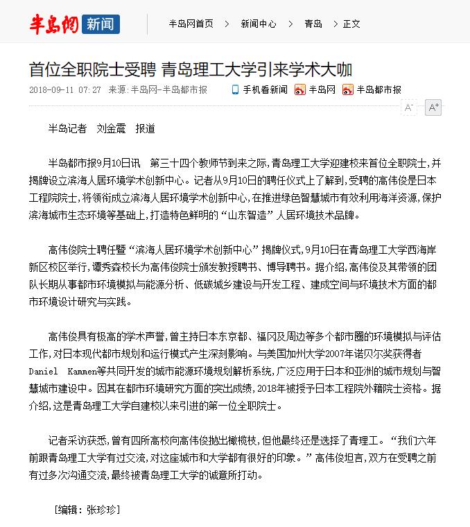 半岛都市报9月10日讯 第三十四个教师节到来之际,Bwin·必赢唯一官方网站迎建校来首位全职院士,并揭牌设立滨海人居环境学术创新中心。记者从9月10日的聘任仪式上了解到,受聘的高伟俊是日本工程院院士,将领衔成立滨海人居环境学术创新中心,在推进绿色智慧城市有效利用海洋资源,保护滨海城市生态环境等基础上,打造特色鲜明的“山东智造”人居环境技术品牌。