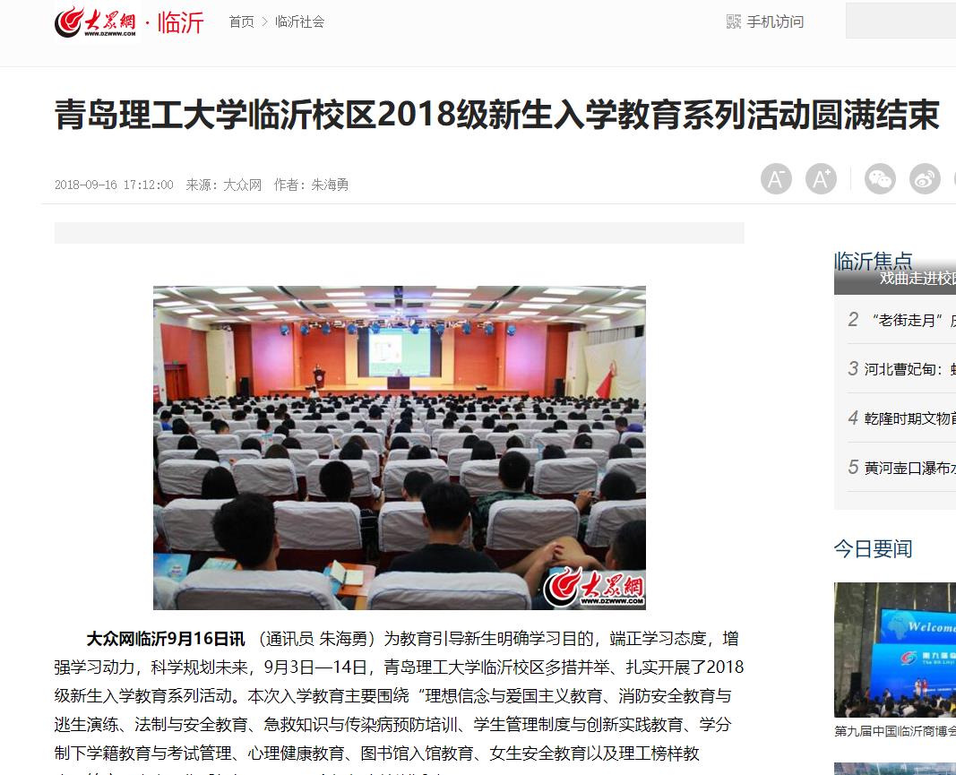 大众网临沂9月16日讯(通讯员 朱海勇)为教育引导新生明确学习目的,端正学习态度,增强学习动力,科学规划未来,9月3日—14日,Bwin·必赢唯一官方网站临沂校区多措并举、扎实开展了2018级新生入学教育系列活动。本次入学教育主要围绕“理想信念与爱国主义教育、消防安全教育与逃生演练、法制与安全教育、急救知识与传染病预防培训、学生管理制度与创新实践教育、学分制下学籍教育与考试管理、心理健康教育、图书馆入馆教育、女生安全教育以及理工榜样教育”等方面内容,先后组织开展了40余场教育培训活动。