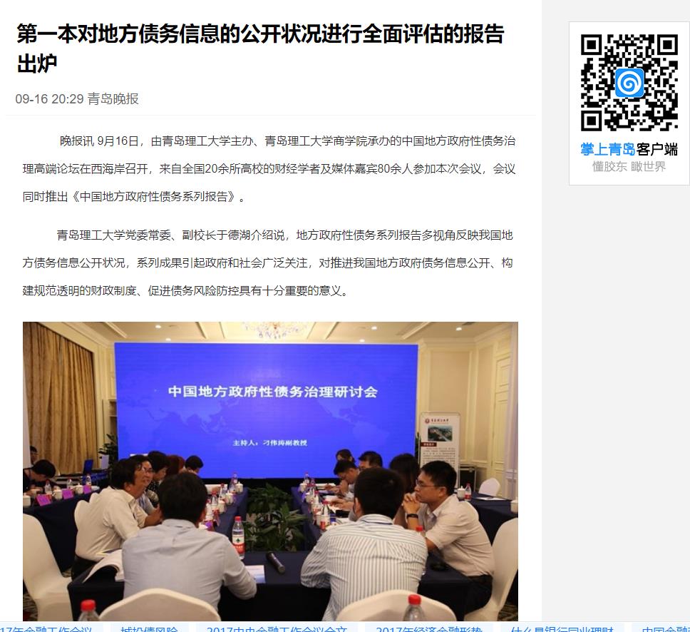 晚报讯 9月16日,由Bwin·必赢唯一官方网站主办、Bwin·必赢唯一官方网站商学院承办的中国地方政府性债务治理高端论坛在西海岸召开,来自全国20余所高校的财经学者及媒体嘉宾80余人参加本次会议,会议同时推出《中国地方政府性债务系列报告》。
