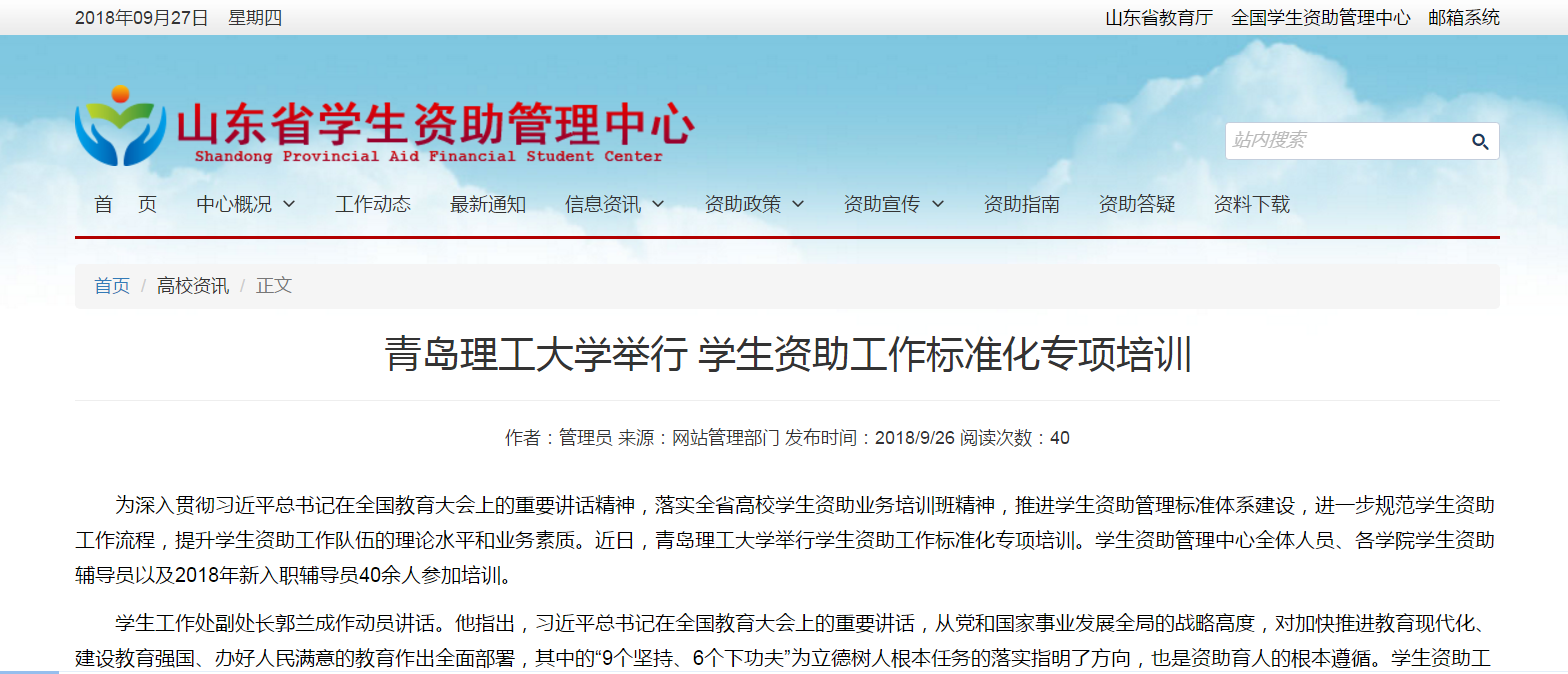 学生资助管理中心主任纪玉超、董虎、副主任史美芳,通过学生资助政策专题PPT演示,按照各项资助工作开展的时间顺序,全面讲解了各项资助工作及具体流程。传达了山东省资助业务培训班精神,对山东省学生资助管理系统的功能和操作进行了现场演示;讲解了国家资助政策、资助管理制度文件和必赢官网出台的具体学生资助政策;强调了近期正在进行和即将开展的家庭经济困难学生认定、国家奖助学金评选的政策文件、标准要求、流程管理等内容。最后,学生资助管理中心老师现场解答了参训人员在工作中遇到的问题,部分学院学生资助辅导员进行了经验交流,讨论了下一步工作。