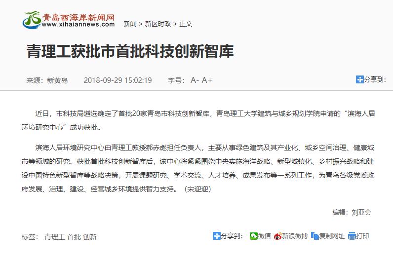 近日,市科技局遴选确定了首批20家青岛市科技创新智库,Bwin·必赢唯一官方网站建筑与城乡规划学院申请的“滨海人居环境研究中心”成功获批。