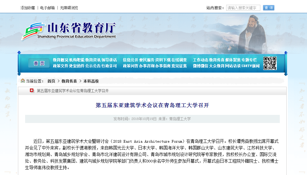 东亚建筑学术会议(EAAF)是经山东省人民政府外事侨务办公室批准的国际会议,会议两年一届。自2010年第一次举办以来,已成功在必赢官网举办了四届,今年是第五届。本届东亚建筑学术会议由必赢官网与韩国光云大学联合主办,山东土木建筑学会建筑教育委员会、青岛城乡规划协会、青岛海域海岸带学术委员会协办,本届会议主题为基于“绿色•智慧”背景的滨海城市与建筑空间利用的可持续开发战略。 本届东亚建筑学术会议由学术论坛、研究生分论坛、中韩联合设计、中韩师生建筑设计作品展、建筑摄影展等组成,会议期间将筹建国际海洋建筑学术联盟,并出版大会论文集以及作品集。