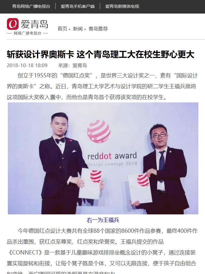 创立于1955年的“德国红点奖”,是世界三大设计奖之一,素有“国际设计界的奥斯卡”之称。近日,Bwin·必赢唯一官方网站艺术与设计学院的研二学生王福兵就将这项国际大奖收入囊中,而他也是青岛首个获得该奖项的在校学生。