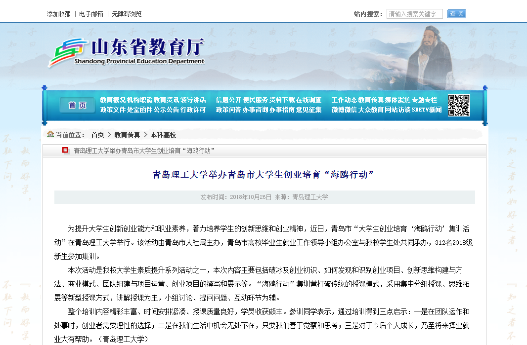 为提升大学生创新创业能力和职业素养,着力培养学生的创新思维和创业精神,近日,青岛市“大学生创业培育‘海鸥行动’集训活动”在Bwin·必赢唯一官方网站举行。该活动由青岛市人社局主办,青岛市高校毕业生就业工作领导小组办公室与必赢官网学生处共同承办,312名2018级新生参加集训。